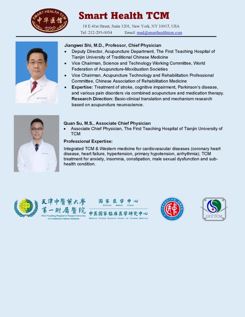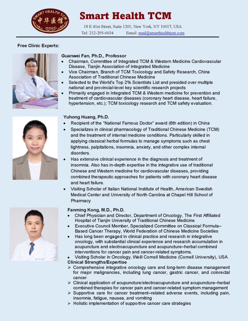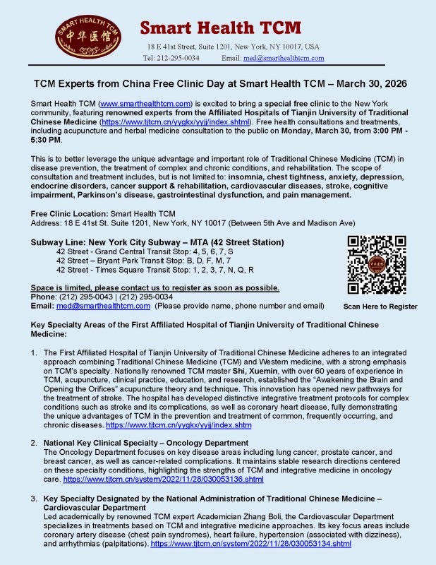 Smart Health TCM is pleased to host a Free TCM Clinic Day on Monday, March 3rd, 2026 from 3 PM to 5:30 PM. Expert from the Affiliated Hospital of Tianjin University of Traditional Chinese Medicine will provide specialized free health consultation and treatment to the community, including acupuncture and Traditional Chinese Medicine (TCM). We invite you to explore how TCM can support your overall health and well-being!
